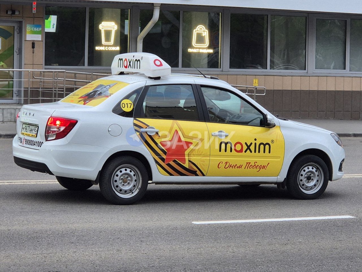 На улицах Кургана, в том числе в Заозёрном, появились машины, брендированные сервисом заказа такси «Maxim» в стилистике приближающегося дня Победы.