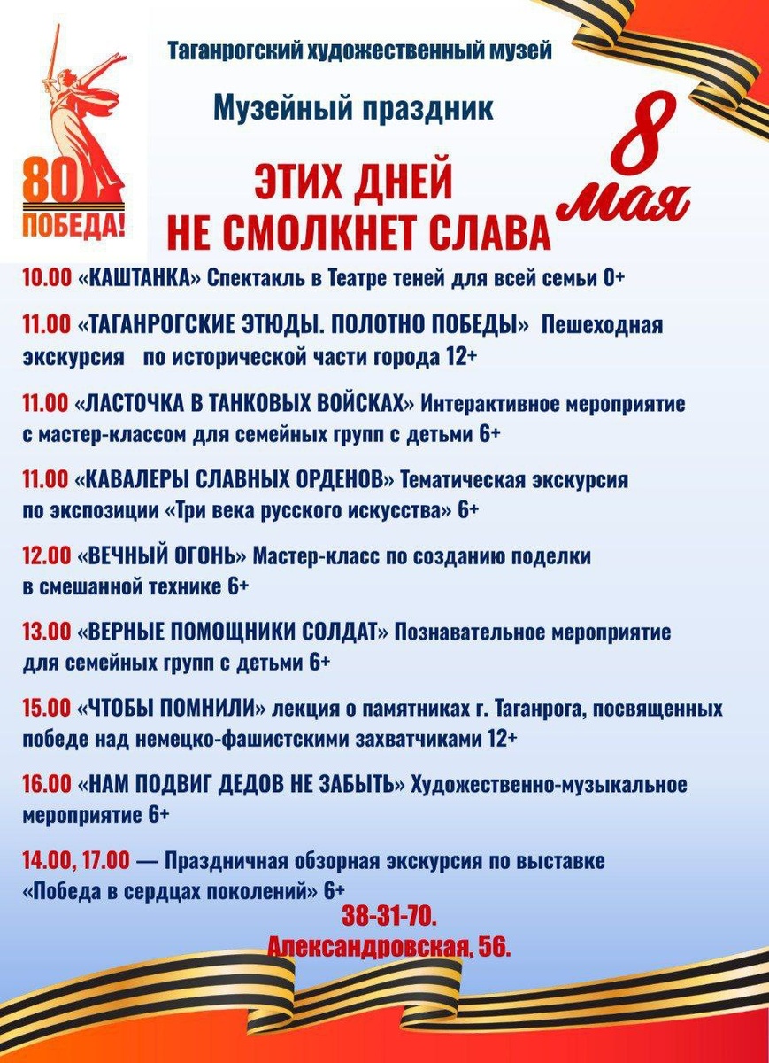 🙋♀️Дорогие таганрожцы и жители города! 🏛Если по погодным условиям отложилась поездка на природу или вы пока еще не придумали, с чего начать эти длинные выходные, то самое время собраться и прийти в художественный музей праздновать наступающий День Победы. 🎖🇷🇺Тем более, что сегодня здесь проходят многочисленные мероприятия музейного праздника "Этих дней не смолкнет слава", посвященного 80-летию со Дня Победы советского народа в Великой Отечественной войне. Уже успешно стартовали первые экскурсии, в том числе и пешеходная "Таганрогские этюды. Полотно Победы", для детей состоялся спектакль в Театре теней и интерактивное мероприятие с мастер-классом "Ласточка в танковых войсках". Вы сможете успеть посетить остальные мероприятия. Яркое художественно-музыкальное мероприятие "Нам подвиг дедов не забыть" подарит вам встречу с юными музыкантами и создаст праздничное настроение. Ждем всех по адресу: ул. Александровская, 56 #мероприятия_в_ТХМ