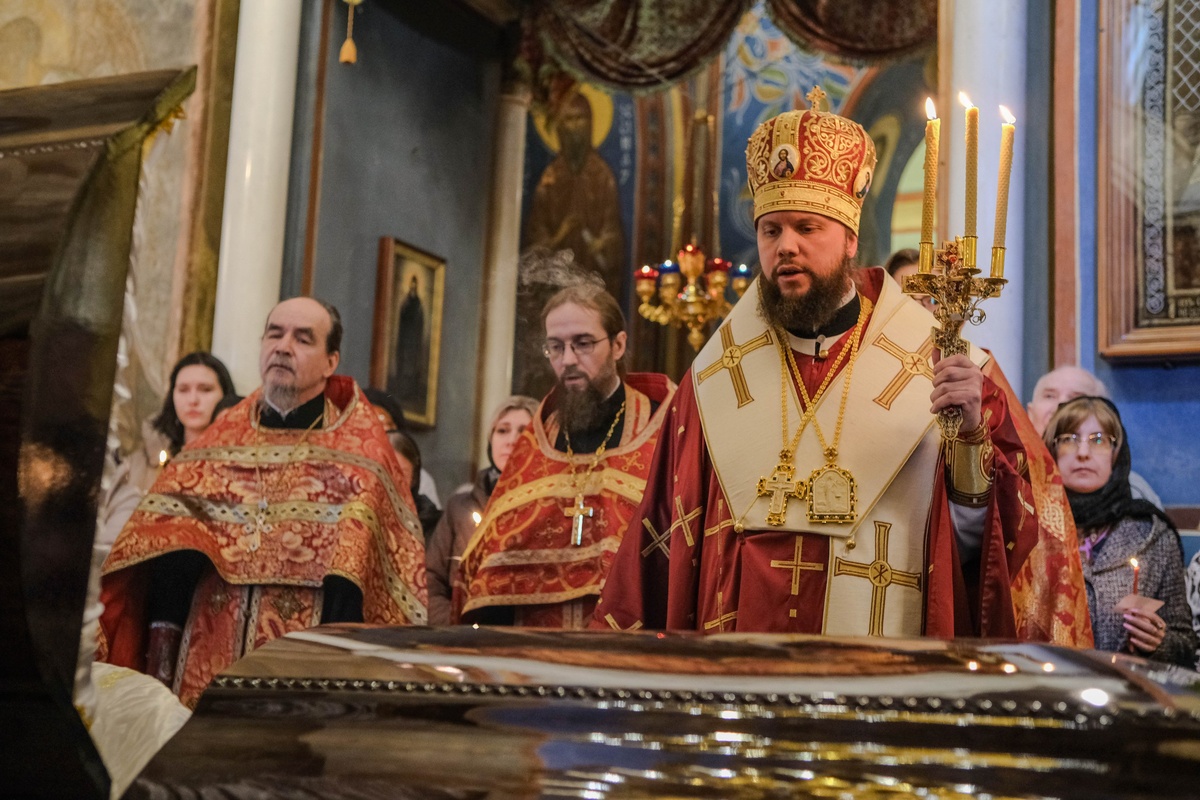 Перед началом заупокойного богослужения владыка Никандр обратился к собравшимся с архипастырским словом, призвав православных христиан молиться об упокоении новопреставленного раба Божия Николая.