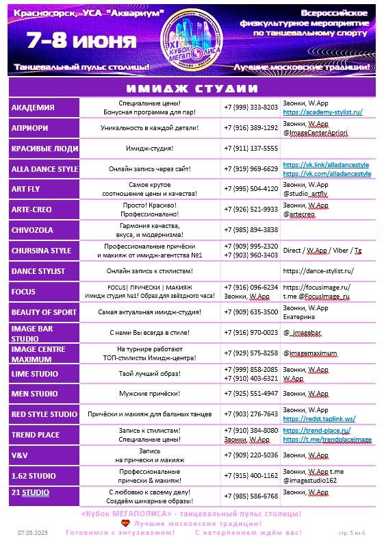 Имидж-студии XI летних традиционных соревнований Кубок МЕГАПОЛИСА - 2025. 💇♀️💇♂️ Лучшие профессиональные стилисты России создадут самые лучшие образы спортсменов Всероссийского физкультурного мероприятия по танцевальному спорту ЛИГА - МАСТЕРС ФТСАРР, Квалификационных соревнованиях ФТСАРР, Российских соревнованиях РСА во всех возрастных группах и классах!