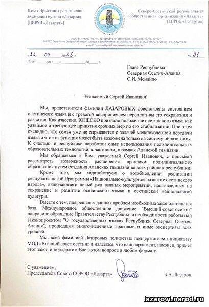 Разделяя тревогу и обеспокоенность народа Осетии за будущее осетинского языка фамилия Лазаровых, наряду с другими фамилиями, обратилась к