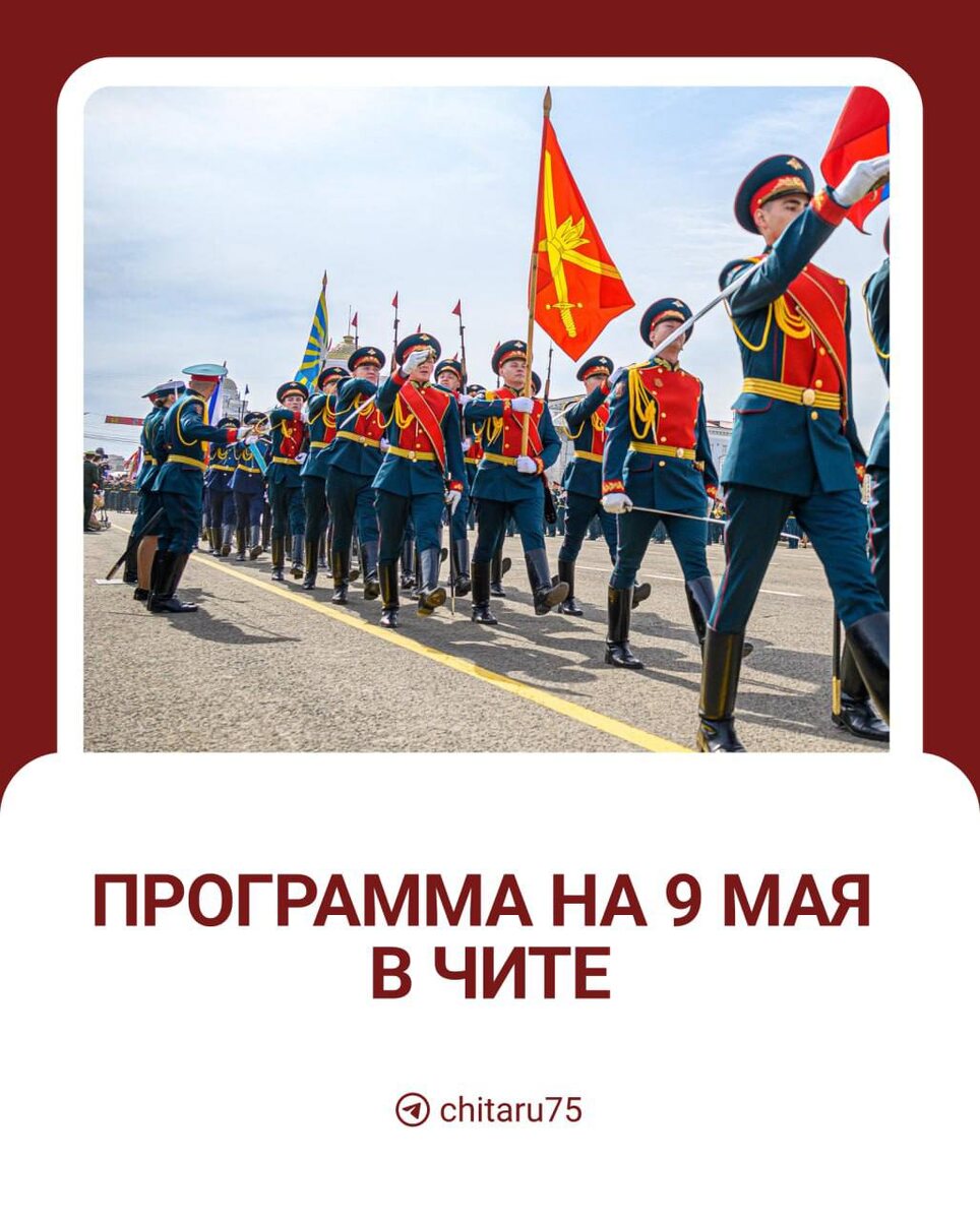 Куда пойти в День Победы в Чите.⬆️ Главный военный парад начнется на площади Ленина в 10:00. 🟦Карта перекрытия дорог — здесь. 🟦Где будет полевая кухня с гречневой кашей — площадки. 🟦Троллейбусы не будут ходить в центре города с утра — маршруты. 🟦 Подписаться | Предложить новость