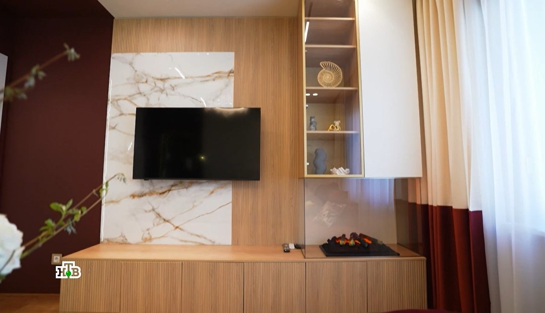 Семейный очаг в гостиной в винных тонах. В квартире у героев «Квартирный вопрос» была полупустая комната, которая планировалась как общая, но в итоге превратилась в склад. Дизайнер превратила это пространство в уютную гостиную, в которой одна стена покрыта чешуей, на вторую пролили вино, а в углу появился камин, который соберет вокруг себя и взрослых, и детей.