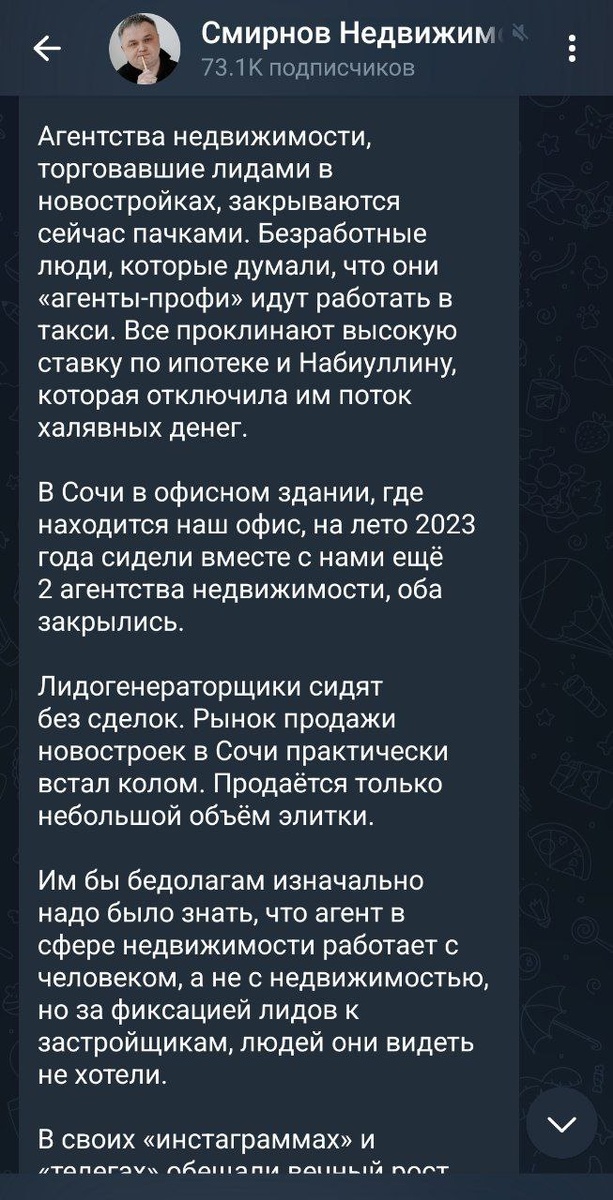У Сергея Смирнова, лидера рынка продавания курсов и франшиз (по версии Сергея Смирнова), и главного скуфа всея агентов (по нашей версии), вышла серия очень смешных постов. Его там бомбит непонятно от чего, просто от существования других агентов, видимо. Очень смешные тейки про то, что нужны были ПРОФЕССИОНАЛЫ на растущем рынке и они наблюдали как таксисты туда сюда в риэлторы и обратно приходили, но без их профессионализма ничего не зарабатывали. Это, разумеется, не так. Зарабатывали все, и профи и не профи. В основном, зависело от беспринципности и желания работать, вот и все составляющие успеха. Поэтому те, кто покупали франшизу или курсы Смирнова, потратили время и деньги, которые могли потратить на окучивание клиентов, заработали бы гораздо больше. Сейчас же, вопиет Смирнов, останутся только профессионалы, но непонятно в чем разница, ведь и до падающего рынка, по его словам, нужны были профессионалы. Смешно про лидогенерацию, на которую они все молились, а теперь, выходит,