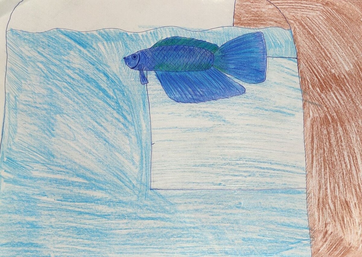 После смерти и захоронения Рубина, я мечтаю о новой аквариумной рыбке, чтобы она жила долго. Так прошло три дня спустя. Мама с дедой привезли живую рыбку петушка. Её окрас сочетается четырьмя цветами: бирюзовым, синим, голубым и лазурным. Он был в прозрачном пакете. Я подержала пакет с рыбкой, открыла им дверь, мама занесла в дом гостинцы и я осторожно закрыла дверь. Мама поменяла старую на новую банку, воду тоже, открыла пакет, вылила в банку воду, переместила рыбку и поставила банку рядом с Солью - это Алисина рыбка. Чтобы синяя рыбка не маскировалась в голубые камешки, мама осторожно насыпала камешки голубого цвета в аквариум Соли, а новичку другие. Я решила придумать рыбке имя. Это мальчик. Я давно узнавала в интернете, что у самцов петушков плавники и хвост длинные, а у самок чуть покороче. Я захотела его назвать Леоном, но кличка может звучать как Лев. Но я немножко перепутала, на самом деле синих или бирюзовых львов не бывает. Львы бывают только рыжие, белые или золотисто-жёлты
