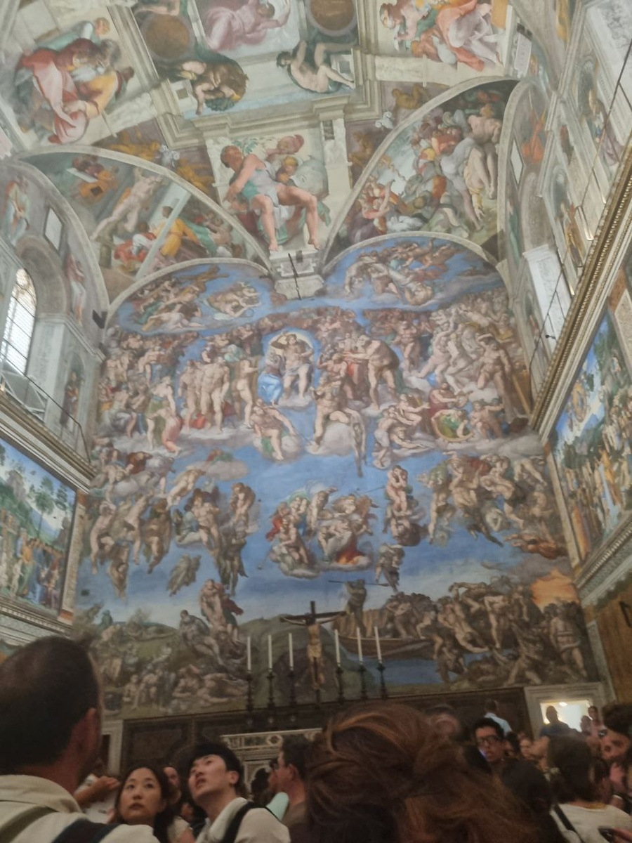 Сначала ты слышишь её: тишина, в которой охранники громко шикают на каждого, кто смеет заговорить. Потом ты её видишь — зал, весь расписанный. Стены, потолок — живые страницы Библии. Снимки сделаны шпионски — под суровым взглядом стражей с наушниками и биноклями. Они бдят, чтобы ни один кадр не нарушил правила. И, как вы понимаете, я нарушила. Факты, которые вы могли не знать: — Капелла была построена в 1473–1481 годах по приказу папы Сикста IV (в честь него и названа).