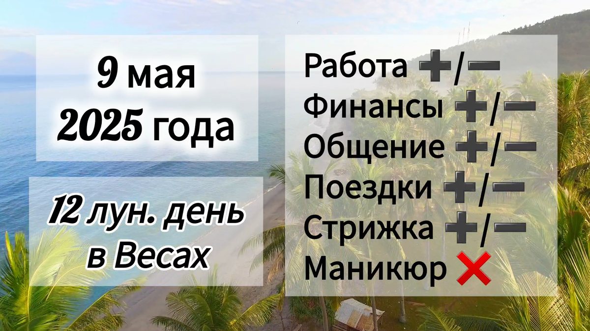 Наступает день, когда не стоит проявлять бурную деятельность, посвятите день отдыху, стройте планы на будущее или займитесь незначительными бытовыми вопросами. Этому периоду присуща рассеянность, сложность в принятии решений и неустойчивое эмоциональное состояние. Не подходит этот день и для финансовых трат: долги вряд ли вернут, а покупки могут оказаться неудачными. Оптимальным решением в этот день будет общение с родными и близкими. Отличное время для романтического свидания со своей второй половинкой при условии, если в отношениях нет недопониманий. В противном случае разногласия могут усугубиться. Благотворно повлияет прогулка или пикник с семьей или с любимым человеком. Уделите особое внимание овощам и фруктам. В этот день рекомендуется следить за своим здоровьем, избегать интенсивных физических нагрузок, не переедать и не злоупотреблять алкоголем.