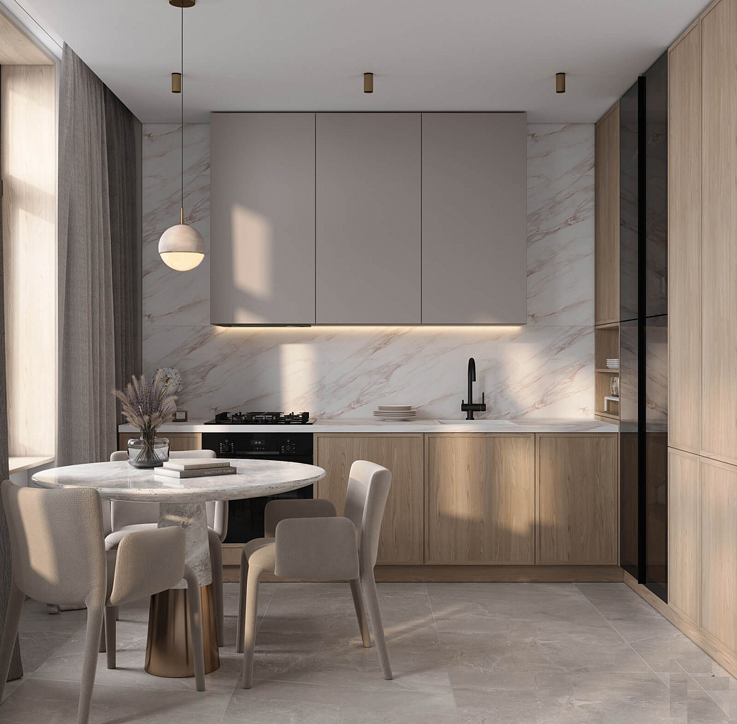 - Фартук и столешница — как правило, из одного материала или в одном тоне. Камень, кварц, крупноформатная плитка. Например, белый камень с серыми прожилками — это прям классика минимализма.