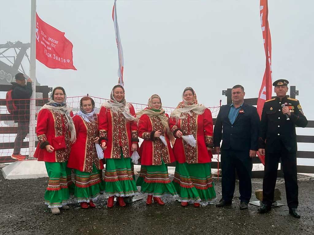 В горном кластере Сочи на Курорте Красная Поляна на высоте 2200 метров над уровнем моря установили копию Знамени Победы. На церемонии прозвучали песни военных лет в исполнении ансамбля «Родные просторы» и солиста, ветерана боевых действий, Владимира Сергеева. Здесь на перевалах Аишха и Псеашха шли ожесточенные бои Битвы за Кавказ. Продвижение гитлеровских войск было остановлено в нескольких километрах от поселка Красная Поляна. Благодаря стойкости и мужеству советских солдат были сорваны планы фашистского командования. В это же время памятные мероприятия проходят во всех районах Сочи. Так, в центре города состоялась торжественная церемония возложения цветов к памятнику солдату-сочинц в Комсомольском сквере на Несебрской. Также на курорте проходит акция «Огонь памяти» – участники военно-патриотических клубов относят к местам братских воинских захоронений лампады с благодатным огнем. Фото: Администрация Сочи