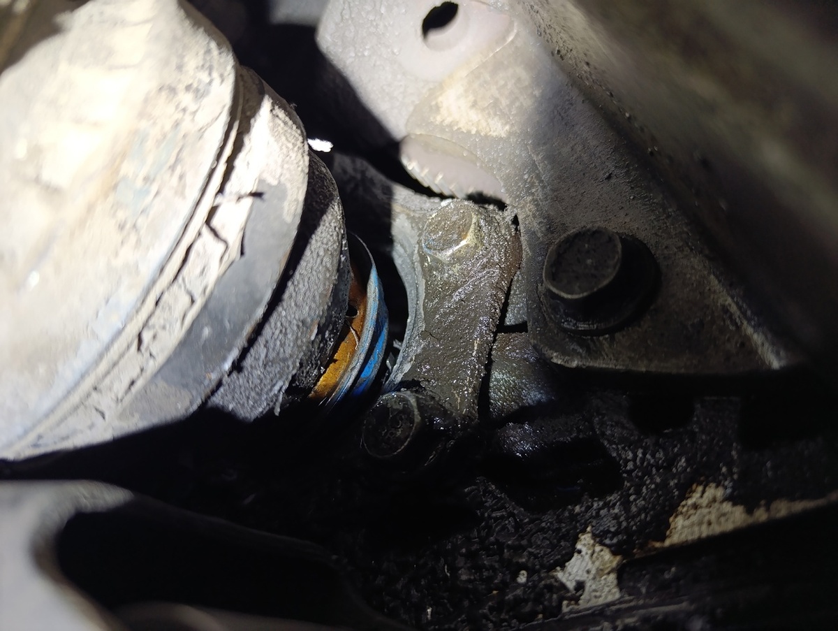 Это было весной, и я заметил что начало капать из под машины, проверил уровень масла в моторе, в норме. Снял защиту и залез посмотреть, а там всё в масле, вытер всё как смог. Потом залез смотрю не капает, думаю ладно поеду по делам, понаблюдаю. Проездил где то 20 км, еду домой, и слышу металлические звуки дзинь дзелинь, остановился, думал может что отлетело, залез посмотрел, вроде всё нормально, доезжаю до дому и опять какие-то звуки. Залез и начал внимательно осматривать и увидел это: Привод вылез с сальником (это правый) и я начал его туда сюда шевелить и там я заметил обломки подшипника. И тут я понял, что придётся снимать дифференциал и пошла разборка))) Поддомкрачиваем две стороны, снимаем передние колеса и откручиваем гайки шрусов. Потом откручиваем гайки шаровых опор и вытаскиваем их из поворотных кулаков стойки. Получается что-то типа такого: Потом постепенно откручиваем поддон, начнёт слегка вытекать масло, подставляем тазик и по чуть его сливаем. Потом снимаем поддон. Вытаск