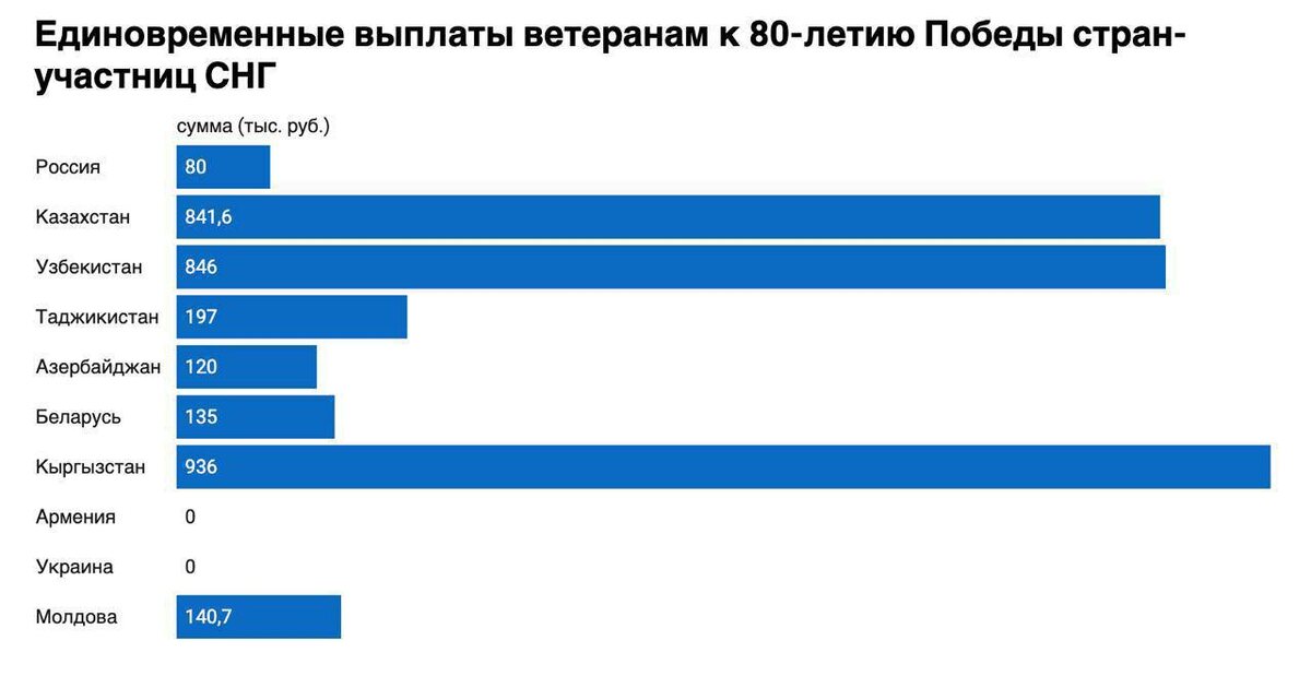 🇨🇾 Ветераны ВОВ в Казахстане получат рекордную выплату к 80-летию Победы 🎖 К 80-летию Победы в Великой Отечественной войне ветераны России получат единовременную выплату в размере 💰 80 тысяч рублей ( это самая маленькая выплата среди остальных стран) , а их коллеги в Казахстане — 💸 5 млн тенге (около 841 тысячи рублей ). Таким образом, казахстанские ветераны получат сумму, превышающую российскую почти в 10,5 раз ! 🤯 Среди стран СНГ Казахстан предоставляет самые высокие выплаты ветеранам ВОВ. 🏆 Исключение составляют Армения и Украина, где такие меры поддержки не предусмотрены. https://dzen.ru/id/65d0bd2d3933641137a41b90 #Победа80 #ВОВ #Ветераны #Казахстан #Россия #Выплаты #ДеньПобеды #СНГ