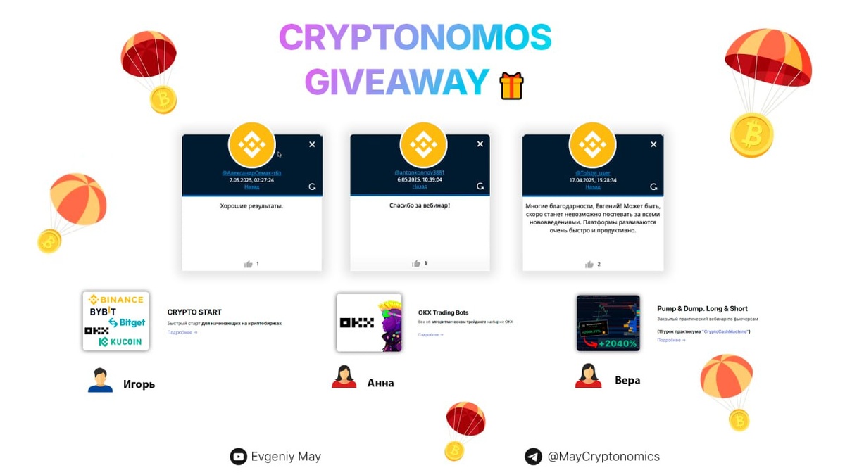 🥳 🏆 Поздравляем с победой в розыгрыше и благодарим за участие 🤗 💲По 0.054 BNB выиграли: 1. AntonKonnov3881 ✅ 2. АлександрСемак-т6з ✅ 3. Tolstyj_user ✅ 👋 Реквизиты для получения выигрыша пришлите Роману - @leonovdev 🔥 Курс/вебинар/урок выиграли: 1. Анна (тел. **90) - Закрытый вебинар "OKX Trading Bots" - https://www.cryptonomos.pro/okxtradingbot ✅ 2. Вера (тел. **73) - 11 урок «Pump&Dump. Long&Short» курса «CryptoCashMachine» - https://www.cryptonomos.pro/cryptocashmachine-lesson ✅ 3. Игорь (тел. **97) - Курс «CryptoStart» https://www.cryptonomos.pro/cryptostart ✅ Участвуйте и выигрывайте 🏆😎 #Cryptonomos #GiveAway