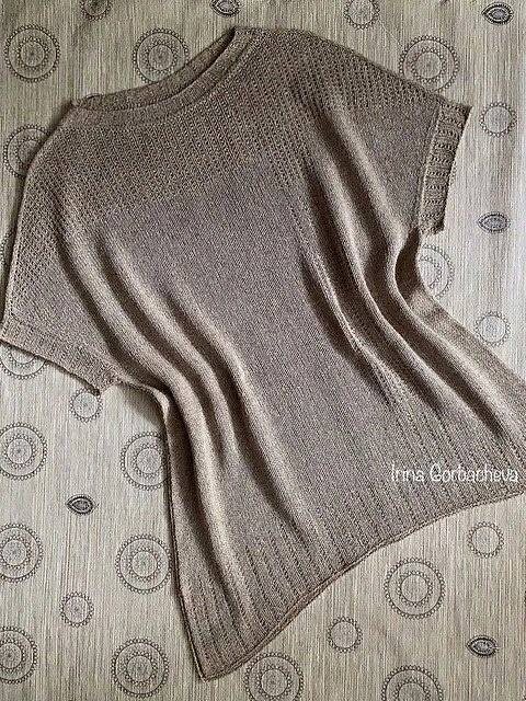 Описание футболки от от Irinа Gоrbаchevа Размеры изделия S, M, L, over size Рекомендуемая пряжа buret silk Scheepjes Cotton Материалы: буретный шелк 470 м/100 г, спицы 2,75. Плотность: 24 петли и 33 ряда в 10 см. Набрать 132 петли: 65 п спинка, 61 п перед, 3+3 п на плечи. Перед разделением на спинке - 162 п, на переде 165 п. Убавки по проймам: в каждом 3-м ряду с обеих сторон, пока не останется 125 п. Соединить перед и спинку, набрав подрезы (можно и без них), и вязать вкруговую. На этом этапе на спицах - 264 п. Далее см. на фото выше ⬆️