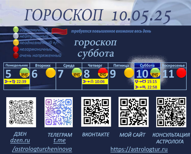 День обещает быть интересным и насыщенным — утром мы оптимистичные, лёгкие и открытые, днём сосредоточены на важных делах, а ближе к ночи можем стать токсичными и капризными. Утро несет легкость, оптимизм, удачу. Мы можем получить нужную информацию, встретиться с тем, с кем хотели, провести переговоры, получить желаемое, сделать то, что задумали. Удача будет на нашей стороне. В это время мы можем увидеть новые перспективы, например, утренний звонок, встреча, совет откроют перед нами новые возможности. День — настрой на практичность и спокойствие. Может появиться желание решить бытовые или финансовые вопросы — например, купить что-то нужное или построить планы на ближайшее время. В этот период мы будем меньше спешить, больше думать о том, как сделать всё проще и надёжнее. Это хороший момент для планирования бюджета или обсуждения важных покупок. Поздний вечер — эмоциональное напряжение. Возможны новости или ситуации, которые заставят нас сомневаться и нервничать. В это время может