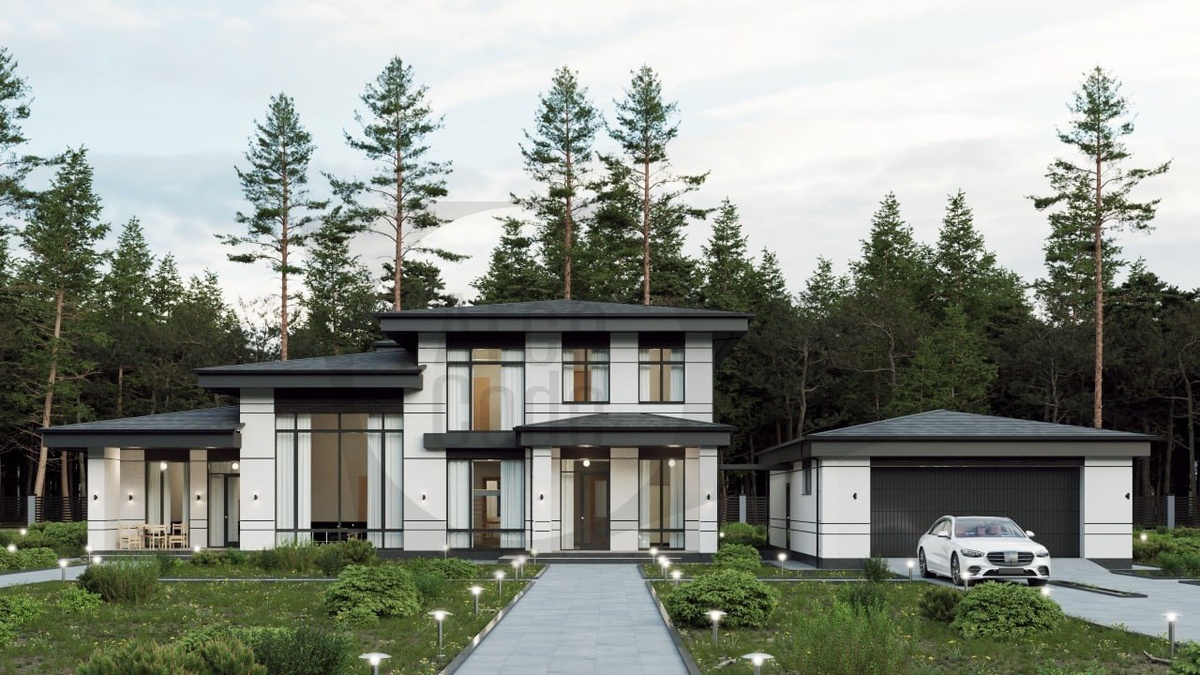 Наше архитектурное бюро ставит перед собой задачу создавать дома, сочетающие эстетику и практичность, где каждый метр служит комфорту. Коттедж «Идиллия» именно такой — гармоничное решение для загородного жилья. Общая площадь дома составляет 336,8 м², включая террасу площею 13,16 м², два крыльца общей площадью 15,43 м² и гараж площадью 84,17 м². Планировка первого этажа: Фокус на удобстве, отдыхе и бытовых потребностях: ✔️ Гостиная — 42,35 м² ✔️ Кухня-столовая — 27,75 м² ✔️ Комната отдыха — 28,6 м² ✔️ Спальня — 20,8 м² ✔️ Ванная — 5,86 м² ✔️ Сауна, душевая и санузел ✔️ Постирочная, кладовая и гардероб ✔️ Холл — 36,11 м² ✔️ Лестничный холл — 14,49 м² ✔️ Гараж с кладовой и техпомещением — 84,17 м² ✔️ Терраса и два крыльца Планировка второго этажа: Зона уединения и отдыха семьи: ✔️ Спальня — 23,5 м² ✔️ Детская комната — 22,54 м² ✔️ Ванная — 12,7 м² ✔️ Гардеробная — 10,75 м² ✔️ Холл — 25,26 м² В «Идиллии» учтены все аспекты—функциональность, простор и комфорт—для жизни в ладу с природой и г