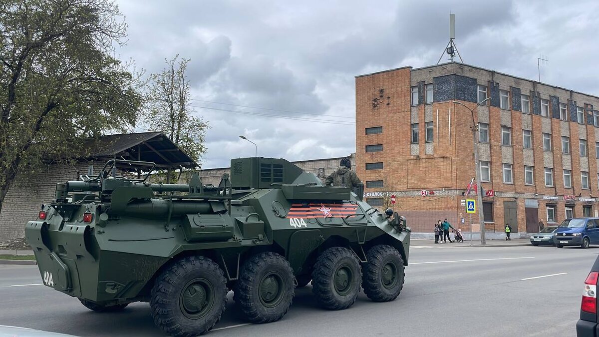 В Пскове готовятся к выставке военной техники. К телеграфу поехали танк, БМП, БТР и несколько квадроциклов. Что еще будет на выставке можно будет посмотреть завтра, 9 мая.