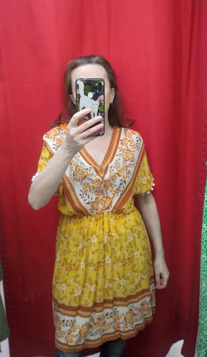 Здравствуйте, всё-таки с возрастом не мудреешь, а чуднеешь, становишься всё чудесатее и чудесатее(( Завалились у меня бусы за икеевский стеллаж, там две корзинки и два отделения с дверками. Я позвала сына, чтобы мебеля отодвинул и достал бусики, он посмотрел на меня круглыми глазами, вытащил одну корзинку, достал бусы и уже я хлопала круглыми удивленными глазами. Почему я не додумалась сама? Видимо, не ищу лёгких путей и чувствую, что я уже больше приношу вреда, чем пользы. Обзор из секонда, цена 590 за кг. Яркое платье с тесьмой из помпончиков по рукавам, в поясе резинка. Хлопок и полиэстер. Прямое платье с короткими рукавами. Это платье цвета хаки, хотя по ткани больше похоже на куртку, очень плотная и жесткая она. Даже застегивается на грубую металлическую молнию, на карманах есть заклёпки как на джинсах. Длинный полосатый кардиган на клевантах. Короткая джинсовая куртка с красивой тесьмой. Хлопок. Удобное платье на лето. Ткань как у футболок, но более толстая и плотная. Хлопок. С