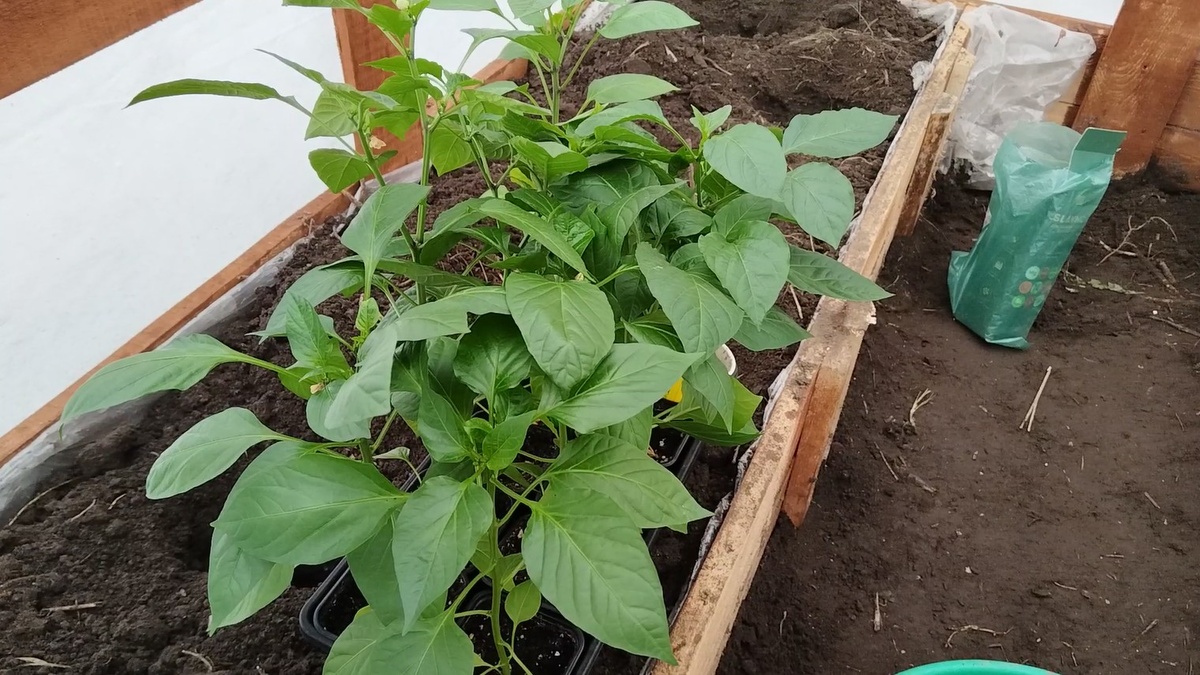 Пора сажать рассаду перца и огурцов. Перед этим я всегда готовлю грядки. Обычно я готовлю грядки с осени, но в этом году пришлось заняться этим весной. На дно грядки я укладываю траву, затем добавляю прошлогодний перегной из перепревшей травы и засыпаю плодородной землей. Трава внизу начинает перепревать, создавая тепло и комфорт для моих перцев. Лунки я делаю чуть больше вашего стаканчика и хорошо проливаю горячей водой для прогрева земли. На дно каждой лунки я кладу древесную золу, чтобы раскислить почву и угодить перцам. Затем добавляю универсальное удобрение, специально предназначенное для перцев. Еще раз проливаю хорошо теплой водой, чтобы образовалось небольшое болотце. Перцы аккуратно вынимаем из стаканчиков и опускаем в лунку. Важно не заглублять их, так как перцы плохо переносят это. Затем слегка приминаем почву вокруг лопаткой, но не слишком сильно. Перцы любят, когда их высаживают плотно. Мы посадили рассаду на расстоянии 20 см друг от друга. Перцы — большие любители поесть,