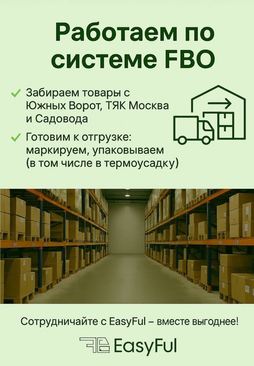 🚀 Фулфилмент — это просто и удобно с EasyFul! Почему наши клиенты выбирают нас: 1. Быстро и надёжно — мы оперативно обрабатываем заказы и аккуратно упаковываем каждый товар. 2. Гибкие условия — подстроимся под ваш объём, сезонность и особенности бизнеса. 3. Лёгкая интеграция — работаем с основными маркетплейсами и платформами, всё синхронизируется автоматически. 📌 Присоединяйтесь — подберём лучшие условия под ваш проект!