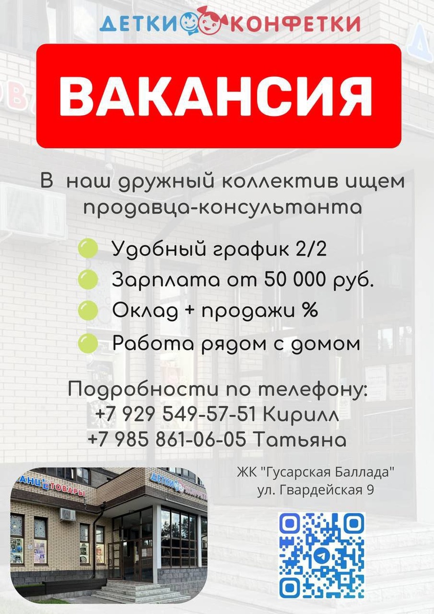🚀 Мы расширяемся! Ищем в нашу дружную команду продавца-консультанта!🚀 Дорогие друзья! Наш Детский Магазин (на Гвардейской 9) продолжает расти, и мы ищем нового коллегу в наш дружный коллектив! Если ты любишь детей, разбираешься в детских товарах и хочешь стать частью команды, где ценят каждого, то тебе к нам! ✨ Что мы предлагаем: - 💼 Интересную работу в атмосфере заботы и позитива; - 💰 Зарплату от 50 000 рублей (оклад + бонусы, детали на собеседовании); - 🕒 Гибкий график 2/2 – удобное сочетание работы и отдыха; - 🎁 Скидки на товары магазина; - � Возможность профессионального роста и обучения. ✨ Что мы ждем от тебя: - 🌟 Желание работать с людьми и помогать им в выборе товаров; - 🌟 Доброжелательность, ответственность и внимательность; - 🌟 Опыт работы в продажах или с детскими товарами будет плюсом, но не обязателен (главное — желание учиться!). Ждем твое резюме или звонок! Давай расти вместе! телефон/Ватсап +79858610605 Татьяна +79295495751 Кирилл🌱