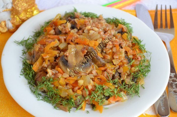 Гречка с шампиньонами От автора: "Гречка с шампиньонами" с легкостью заменит Вам курицу или мясо, я приготовила данное блюдо просто для разнообразия. Ингредиенты: Грибы шампиньоны - 200 гр. Морковь - 150 гр. Лук репчатый - 1 шт. Вода - 200 мл. (кипяток) Соль - 5 гр. Перец черный молотый - 5 гр. Гречневая крупа - 90 гр. Масло растительное - 50 мл. (для жарки) Источник: https://rusdinner.ru/page/grechka-s-shampinonami