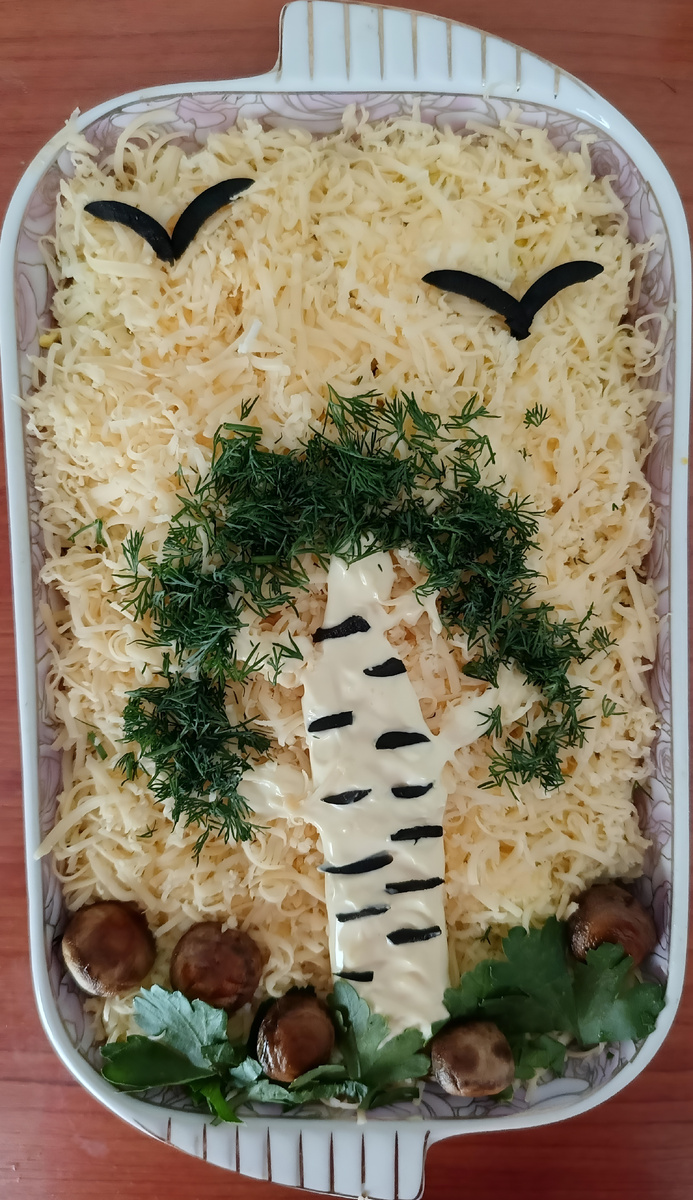Этот легкий, вкусный и полезный салат сочетает нежное мясо, пикантность сыра и сладость чернослива. Он отличается нежным вкусом и оригинальной подачей. Существует много рецептов этого салата, и я поделюсь одним из них. Ингредиенты: 🥩мясо — 300 гр. 🍇чернослив — 200 гр. 🍄шампиньоны — 300 гр. 🧀сыр твёрдый — 150 гр. 🥚яйца — 3 шт. 🍶майонез 🧂соль, перец — по вкусу 🌿зелень — для украшения Приготовление: Отварите мясо заранее в подсоленной воде до готовности. Охладите его и нарежьте кубиками среднего размера. Салат выкладывается слоями на плоское блюдо или в салатницу с низкими бортами. Чернослив залейте кипятком на 10 минут, затем нарежьте кубиками. Грибы нарежьте пластинками и обжарьте с двух сторон по 5 минут на небольшом огне. Яйца натрите на мелкой тёрке. Твердый сыр натрите на мелкой терке. Для придания салату тематического вида можно сделать "берёзовые полоски" из тонко нарезанного чернослива или майонеза. При желании украсьте салат измельчёнными грецкими орехам