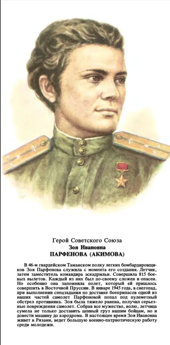Зоя Ивановна Парфенова (Акимова)- единственная женщина чувашка удостоенная звания Героя Советского Союза . Участник Великой Отечественной войны, заместитель командира эскадрильи 46-го гвардейского ночного бомбардировочного авиационного полка, гвардии старший лейтенант, Герой Советского Союза. Зоя родилась 21 июня 1920 года в городе Алатырь Симбирской губернии (сейчас Чувашская Республика )в семье рабочего. Окончив семилетнюю школу, Зоя продолжила обучение в медицинском училище. Девушка мечтала о небе и авиации. Узнав, что Алатырским аэроклубом был объявлен очередной прием курсантов, тайком от родных и друзей Зоя подала заявление в аэроклуб, прошла комиссию и поступила. Совмещать учебу и в аэроклубе и в медицинском училище было нелегко, но какие трудности могут остановить если впереди ждет небо. Сдав экзамены и став медицинской сестрой, Зоя продолжала учебу и в аэроклубе. В 1939 г. Зоя Ивановна с отличием окончив аэроклуб была оставлена работать в нем летчиком-инструктором.