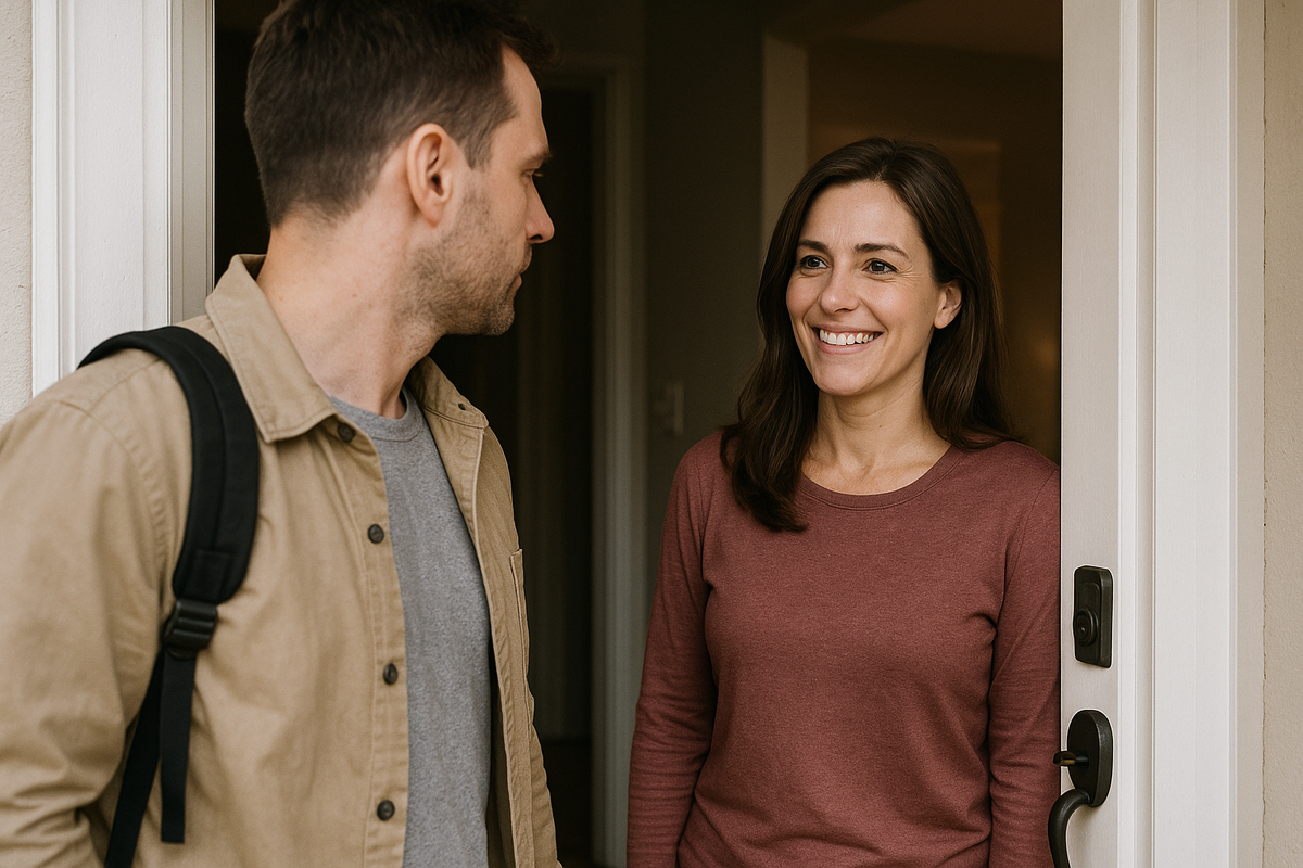 Муж застыл на пороге, держа в руке ключи и телефон. На нем была легкая куртка, будто он собирался ненадолго выйти. У двери стояли его старые кроссовки, и всё указывало на то, что он не планировал ничего серьёзного. Но в этот момент за его спиной раздался знакомый голос: