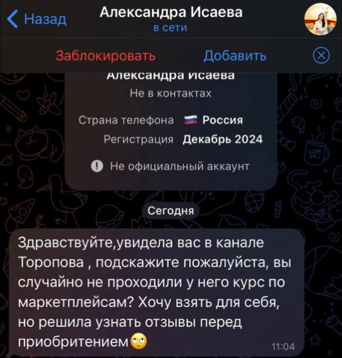 Это скам и спам!! Курсов по маркетплейсам у меня никогда не было! В телеграмме пошла такая рассылка! Прошу блокировать, такие не экологичные заходы 🙏 Кстати отзывы про Торопова, можно посмотреть здесь ⤵️ https://t.me/+kCztlr5wpfAwMzUy 😉