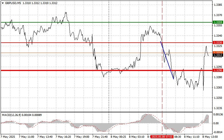 Тест цены 1.3330 в первой половине дня пришелся на момент, когда индикатор MACD только начинал движение вниз от нулевой отметки, что стало подтверждением правильной точки входа на пролажу фунта. В результате пара снизилась на 40 пунктов.