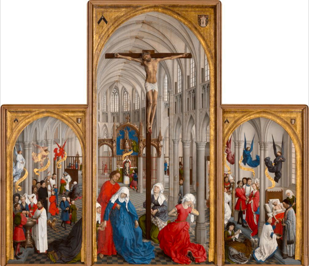 Заказ на эту работу Рогир ван дер Вейден, городской художник Брюсселя, получил около 1450 года. Крещение, миропомазание, покаяние, евхаристия, венчание, елеосвящение, священство — все семь таинств расположены внутри высокой готической церкви, вокруг натуралистически изображенного огромного Распятия, под которым оплакивают Христа Дева Мария, Мария Магдалина, Иоанн Богослов и другие. Глаз зрителя перемещается от одного таинства к другому, то и дело останавливаясь на Распятии, без которого никакие таинства не возникли бы и не имели бы смысла. В глубине бокового нефа храма, на центральной панели, мужчина в зеленом дублете и красном капюшоне перелистывает книгу, помещенную за решеткой. Сегодня, как и раньше, в католических храмах лежат молитвословы, по которым можно следить за ходом мессы и чтением евангельских отрывков. Однако если сейчас такие книги лежат свободно и священники полагаются на честность приходящих в храм, то в Средние века манускрипты были слишком ценны, чтобы оставлять и