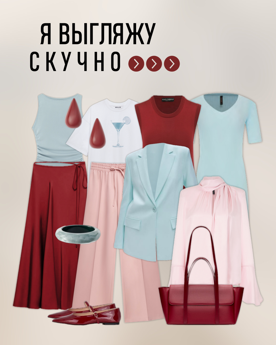 За основу можно было взять голубой костюм, но у нас не было подходящих брюк, поэтому взяли контрастные розовые и бордовую юбку. ⠀