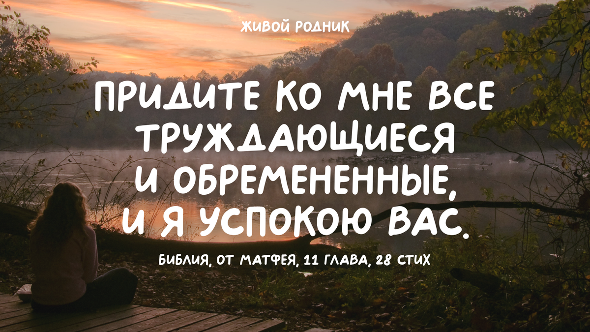 Придите ко Мне все труждающиеся и обремененные, и Я успокою вас. Библия, Евангелие от Матфея, 11 глава, 28 стих Когда всё вокруг нас хорошо, эти слова нам, кажется, не очень нужны. Но, поверьте, они являются бесценным даром, когда вы проходите в своей жизни «долиной смертной тени», встречая переживания и тревоги. Когда небо затянуто грозными тучами, и никто из людей не может помочь. И только Господь и Его Слово могут утешить страждущее сердце. Поэтому ищите Господа, когда Его можно найти, призывайте Его когда Он близко. Библия, Исаия, 55 глава, 6-21 стихи Любое слово, сказанное человеком из самых лучших побуждений, может принести боль, и только Слова Господа, как елей, утешают и врачуют сердце. Поэтому, особенно сегодня, будем пребывать в Слове Божьем, искать общения с Ним, и мы найдём для себя и своих душ утешение и покой! Вручим свою жизнь Господу и будем жить спокойно, ибо Он печётся и заботится о каждом из нас! Обильных вам Божьих благословений в этом дне, и да сохранит вас Господь
