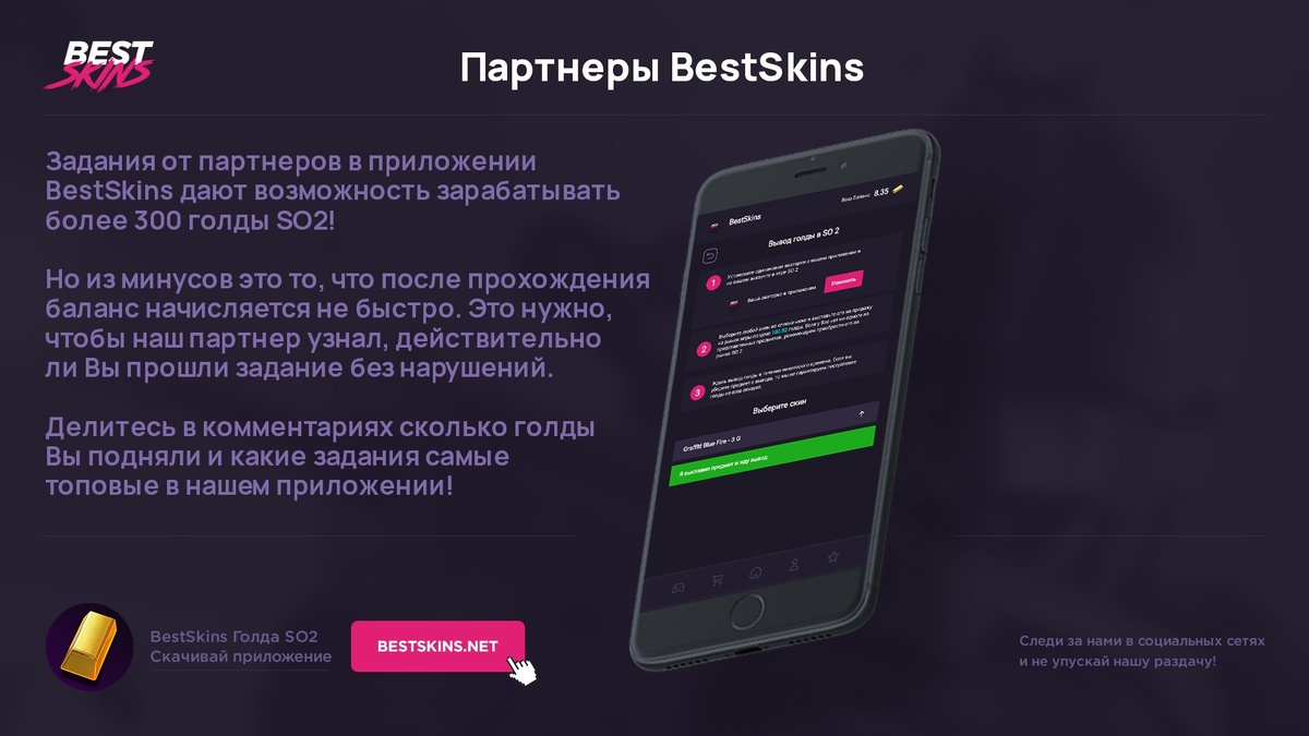 Самый топовый заработок BestSkins Голда 😱 Задания от партнеров приносят наибольшее количество голды! Но есть один минус - приходится ждать начисления 🥶 Не переживайте, голду получить каждый, кто прошел задания без нарушения правил. А пока ждете - не теряйте время и проходите еще! ❤️ 🦄 Скачать - https://bestskins.net/