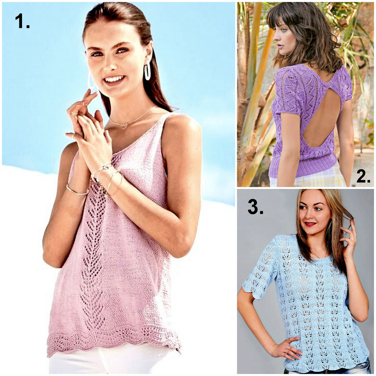 3. Голубой топ с лиственным ажурным узором. Нежная женская модель на лето. Простой фасон позволяет данному топу вписаться в любой ансамбль, а небесно-голубой оттенок удачно освежит цвет лица! Особая изюминка — волнистый край, который получается благодаря узору. Прямой фасон до пояса, втачной рукав до локтя и U-образный вырез горловины.