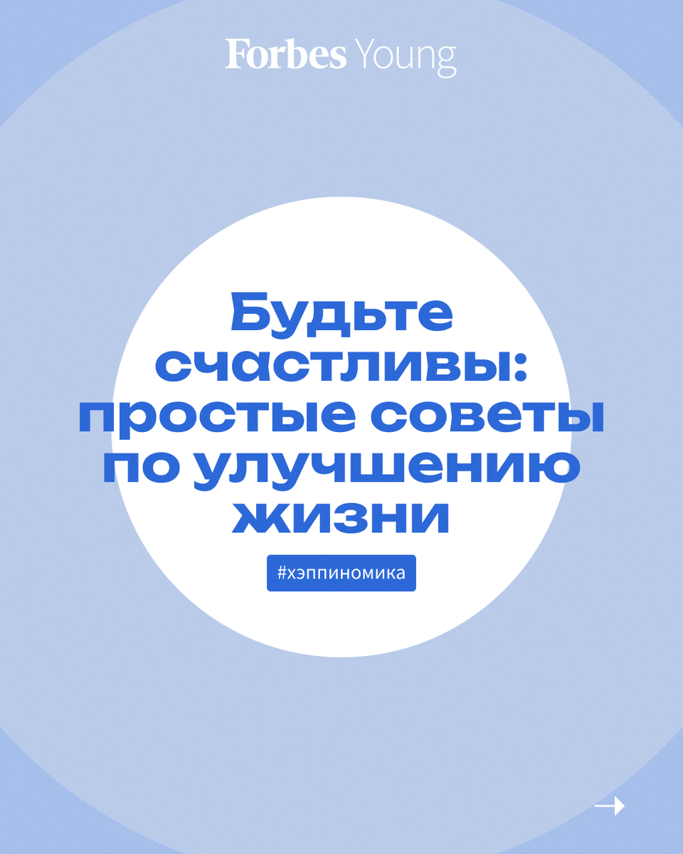 Вычитали в The New York Times несколько необычных советов о том, как стать чуточку счастливее. Их собрала автор раздела «Здоровье» Дженси Данн, которая регулярно в силу своей профессии обсуждает с разными людьми вопросы благополучия. Советы, которые она слышала от разных людей и которые ей больше всего запомнились, собрали в статье. #хэппиномика @forbes_young Придумайте странный ритуал По словам Майкла Нортона, специалиста по поведению человека и автора книги «Эффект ритуала», небольшие ритуалы могут добавить легкости и смысла в повседневную жизнь. Создать такой ритуал можно вокруг чего угодно. Например, в его семье есть ритуал втыкать свечи в мясной рулет и петь песню «С мясным рулетом тебя» на мотив «С днем рождения тебя» — ритуал сложился, когда Нортоны не могли накормить мясным рулетом свою маленькую дочь и придумали, как заинтересовать ее этим блюдом. Общайтесь с молодыми людьми Такой совет дала Маргарета Магнуссон, 90-летняя автор книги «Шведское искусство жить на полную