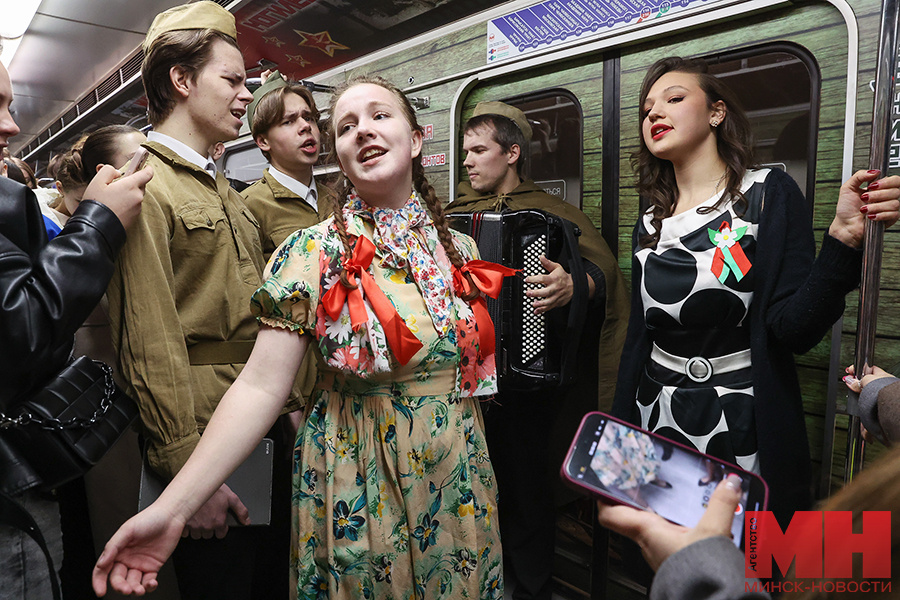 Креативную акцию в столичном метро по названием «И все о той весне» 8 мая организовал актив Минского городского комитета ОО «БРСМ», передает корреспондент агентства «Минск-Новости». Стартовой точкой акции стала ст. м. «Площадь Победы», где собралась молодежь в колоритных костюмах, платьях и военной форме с музыкальными инструментами. Толпа ждала поезд Памяти, чтобы войти внутрь и прямо в вагонах исполнить знаменитые военные песни. — Всем пришелся по вкусу наш музыкальный проект «Родные песни споем вместе», поэтому мы решили спустить его в столичную подземку и подарить нашим жителям и гостям праздничное настроение. Символично, что мы начинаем акцию именно здесь, на станции метро «Площадь Победы». Каждая композиция, которую исполнят наши артисты, будет посвящена военной тематике, — отметил второй секретарь Минского городского комитета ОО «БРСМ» Константин Андрусевич. Едва брендированный состав прибыл на платформу, ребята дружной толпой двинулись внутрь. Удивленные пассажиры наблюдали, ка