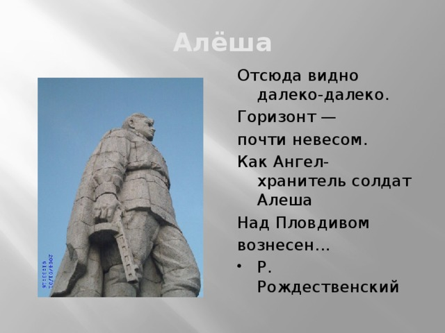 Стихотворение начинается с представления Алёши — простого советского солдата, чей образ сразу вызывает тёплые и уважительные чувства. Рождественский создаёт его как близкого, почти родного героя: