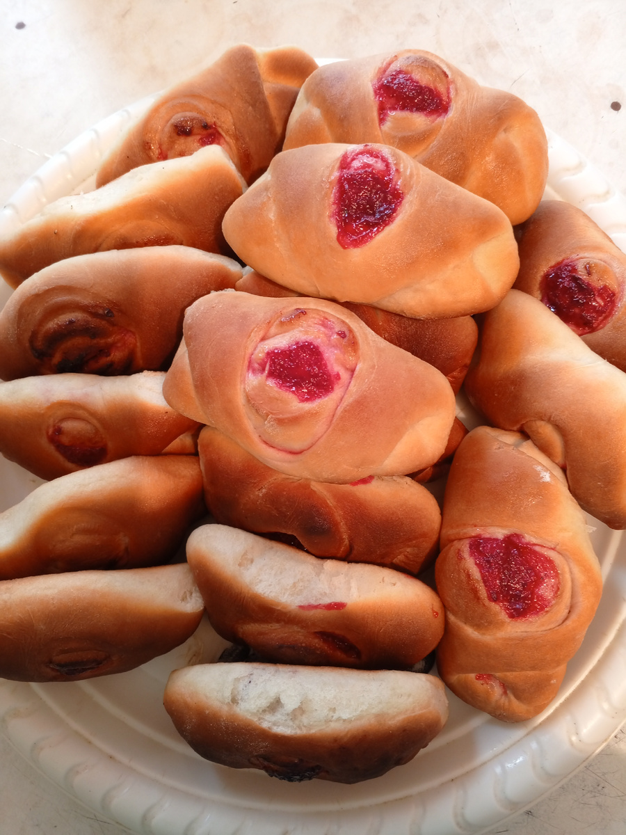 Приняла готовить сдобные булочки,достала баночку замороженной клюквы из ларя(морозильного) а она там так замерзла,что ее не достать.Горлышко у этой баночки маленькое .Взяла в холодильнике размороженную клюкву с сахаром и налепила булочек.Но клюквы положила мало так как она очень жидкая.А с крахмалом или мукой ,такую начинку я не люблю.Обычно мороженной кладу порядочно и леплю булочки ,вытекает иногда, но мало.Напекла булочек и сварила куриный суп с рисом.