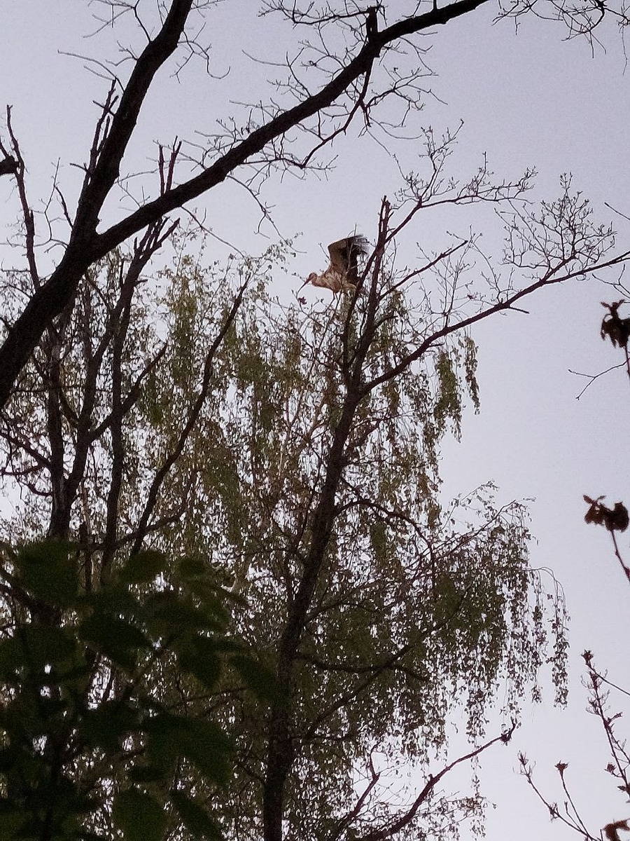 Аисты - у нас в посадке. Два аиста крудили вокруг березки. А недалеко давно висит свитое огромное гнездо. Видимо им принадлежит.