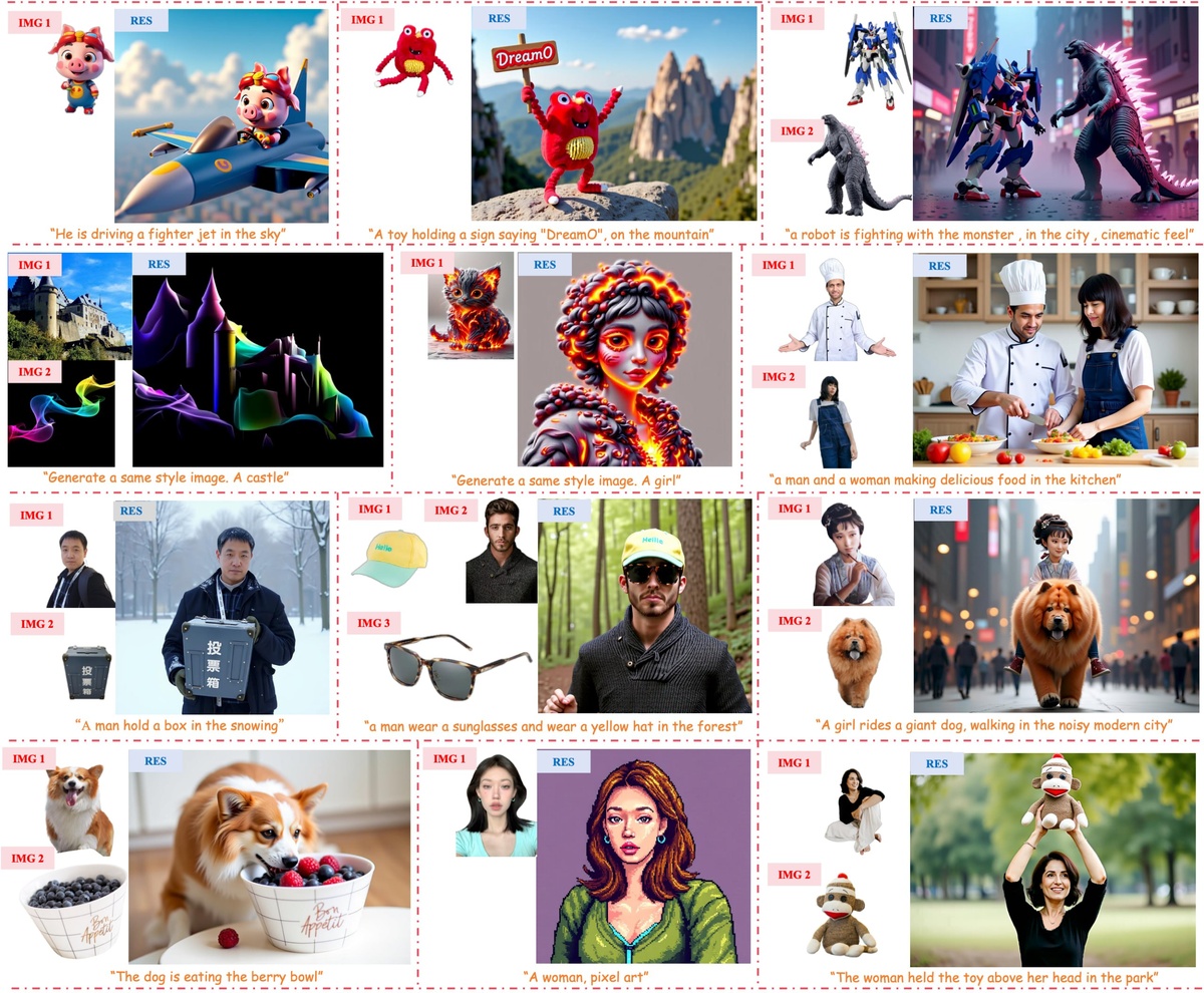 DreamO: фреймворк для вписывания объектов на изображение. Это тоже персонализатор как Infinite You, ID-Patch, InstantID и другие, но он работает не только с людьми и определёнными композициями, а в широком спектре задач. Например, помимо вписывания двух персонажей, можно комбинировать объект и стиль (см. замок и абстракцию), человека и пару предметов гардероба, итд. Гитхаб Бумага