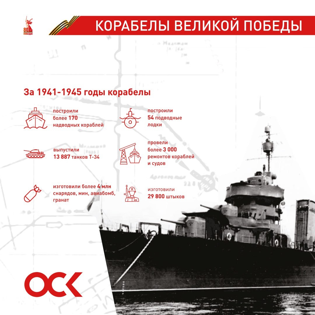 Уважаемые коллеги! Поздравляю вас с Днем Победы! Память о подвиге нашего народа, сокрушившего фашизм и отстоявшего Родину, живет в сердце каждого из нас. В год 80-летия Великой Победы мы по-особому осознаем ее непреходящее значение, понимаем, насколько хрупок мир и как важно его беречь. Сегодня в ОСК собирают и хранят свидетельства военного периода жизни предприятий корпорации, героизма корабелов на фронте и в тылу. Ценой неимоверных усилий рабочие и инженеры по всей стране строили и ремонтировали корабли, выпускали танки, бронепоезда, изготавливали снаряды, вооружение. Конструкторские бюро работали над совершенствованием довоенных проектов и созданием новых. Военно-Морской Флот был обеспечен первоклассными образцами морской техники, мощными кораблями и подводными лодками, которые оказали серьезное влияние на ход боевых действий. Пройдя войну и завоевав Победу, корабелы восстановили разрушенные заводы и подняли кораблестроение, обеспечивая обороноспособность страны уже в мирное время.