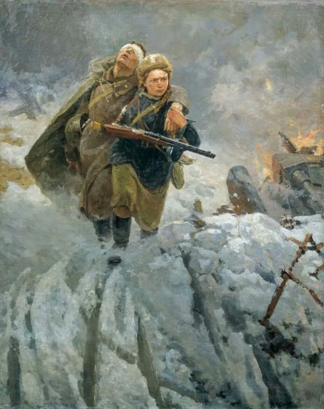 Марат Самсонов (1925—2013). Сестрица. 1953. Художник — участник парада Победы Георгий Савицкий (1887—1949). По следам врага. 1942 Николай Присекин (1958—2015). Лихолетье. 1984 Константин Щекотов (1909—1975). Допрос партизанки (Зоя Космодемьянская). 1959 Игорь Раздрогин (1923—2018). Александр Матросов. 1957. Автор картины — сам ветеран войны, ушёл на фронт добровольцем, трижды ранен в боях Аркадий Пластов (1893—1972). Фашист пролетел. 1942 Анатолий Шибнев (1907–1990). Пленных ведут. 1946 Александр Лактионов (1910—1972). Письмо с фронта. 1947