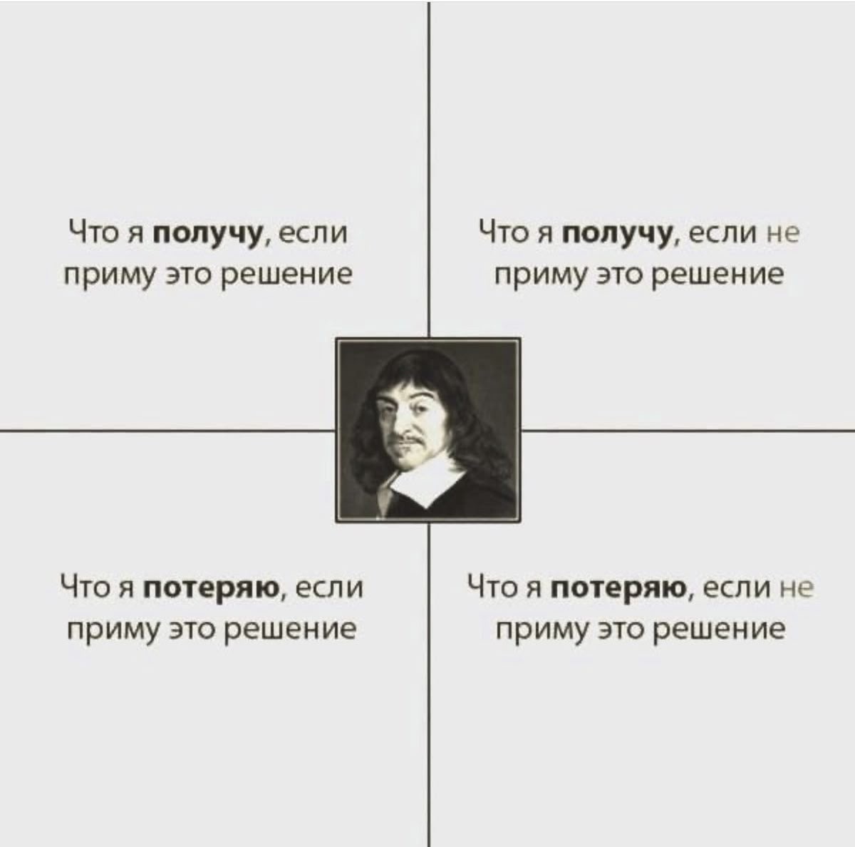 Поможет простая и мощная методика «квадрат Декарта» основанная всего на 4 вопросах. Её суть — включить рациональное мышление и увидеть ситуацию с разных сторон, прежде чем сделать важный шаг. Вот как она работает: ✦ Представь, что ты стоишь перед выбором. Например: увольняться или нет, ехать в другой город, начинать отношения и т.п. Теперь задай себе 4 вопроса: Что будет, если я это сделаю? (Плюсы, выгоды, возможности — что получишь?) Что будет, если я этого не сделаю? (Что останется, что потеряешь? Что сохранится, а что упустишь?) Чего не будет, если я это сделаю? (Какие минусы и потери ждут при этом решении?) Чего не будет, если я этого не сделаю? (Какие возможные блага ты упустишь, если ничего не поменяешь?) 🔍 Эта техника помогает увидеть и рациональные последствия, и эмоциональные ловушки: страхи, иллюзии, желания угодить другим. 💡Важно: не торопись с ответами. Подумай, запиши. Иногда самые важные инсайты — в последнем вопросе.