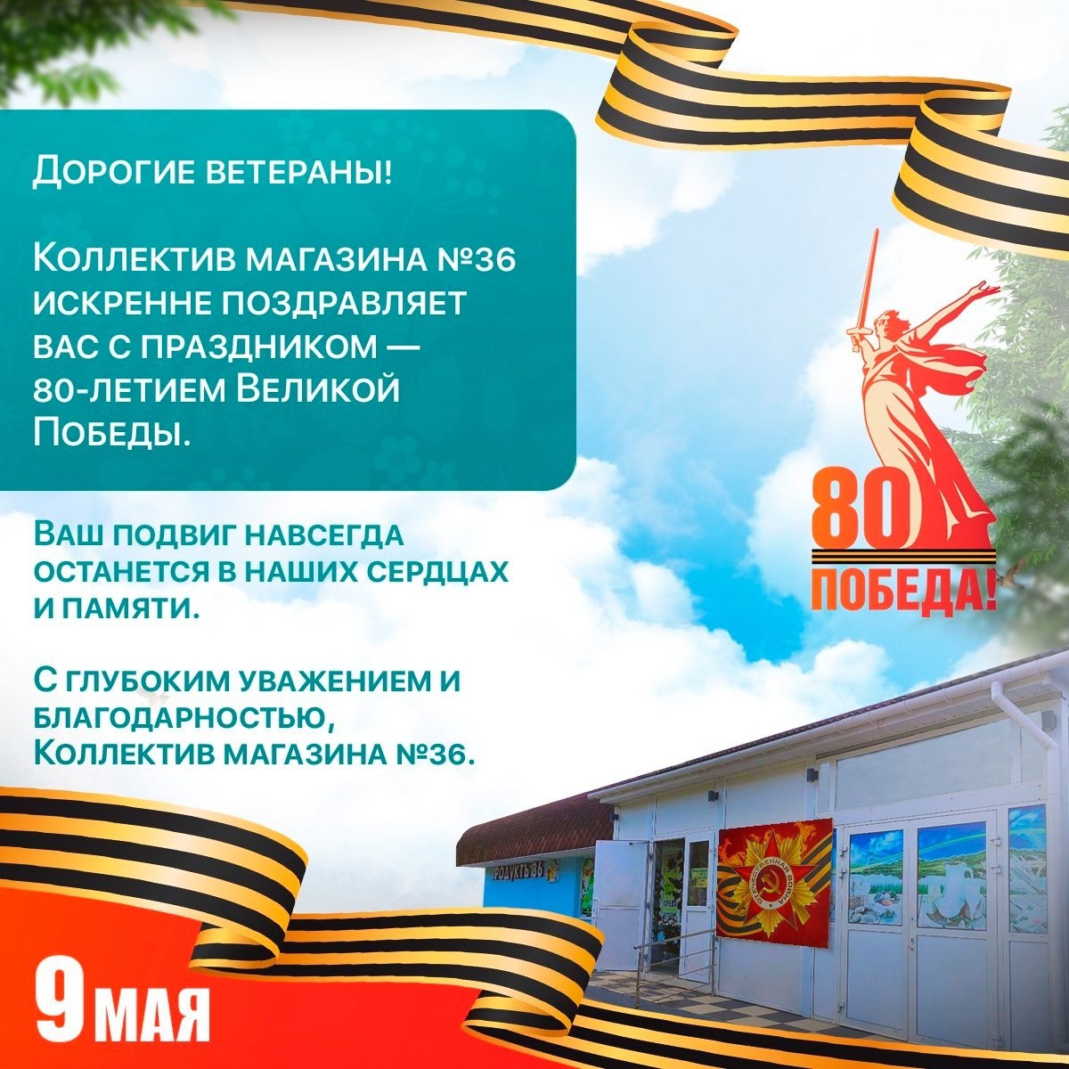 Дорогие ветераны! Коллектив магазина №36 (https://vk.com/tvoimagazin36) искренне поздравляет вас с праздником — 80-летием Великой Победы. Спасибо вам за мужество и героизм, за светлое будущее и мирное небо над головой. Ваш подвиг навсегда останется в наших сердцах и памяти. С глубоким уважением и благодарностью, Коллектив магазина №36. В честь праздника 80-летия Великой Победы весь май ветеранам Великой Отечественной войны предоставляется скидка 10% (https://vk.com/wall-229469525_215) на весь ассортимент магазина.