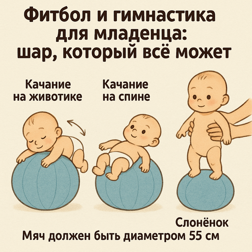 Мяч должен быть диаметром 55 см для младенца — маленький, но упругий, как характер у новорождённого.