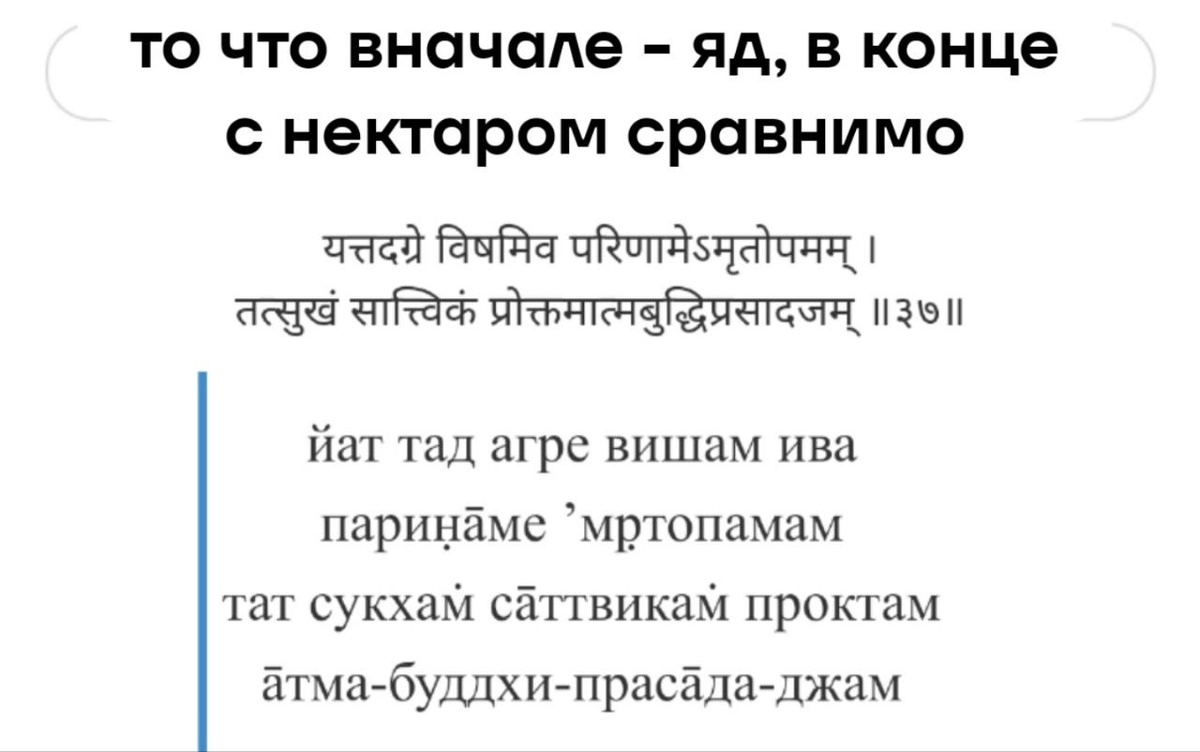 Веды. Бхагавад Гита, 18:37 💎Что ни фраза - бриллиант. Одна из глубоких истин этой мудрости (в разрезе времени): если начинать с трудного, тяжёлого, невкусного, то в конце то же самое оборачивается лёгким, радостным, сладостным. И наоборот, если начинать с приятного, то в конце то же самое обернётся ядом. Ещё одна грань (в аспекте действий): твои усилия всегда получают награду В призме манипуляции: накорми ум нектаром и приступи к работе с ядом, который так же преобразуется в нектар. Так ум привыкнет думать, что трудиться - это хорошо, потому что запоминается то что в начале и в конце. И плоды изобилия всегда будут - в твоих ладонях😊 Какие смыслы увиделись вам?