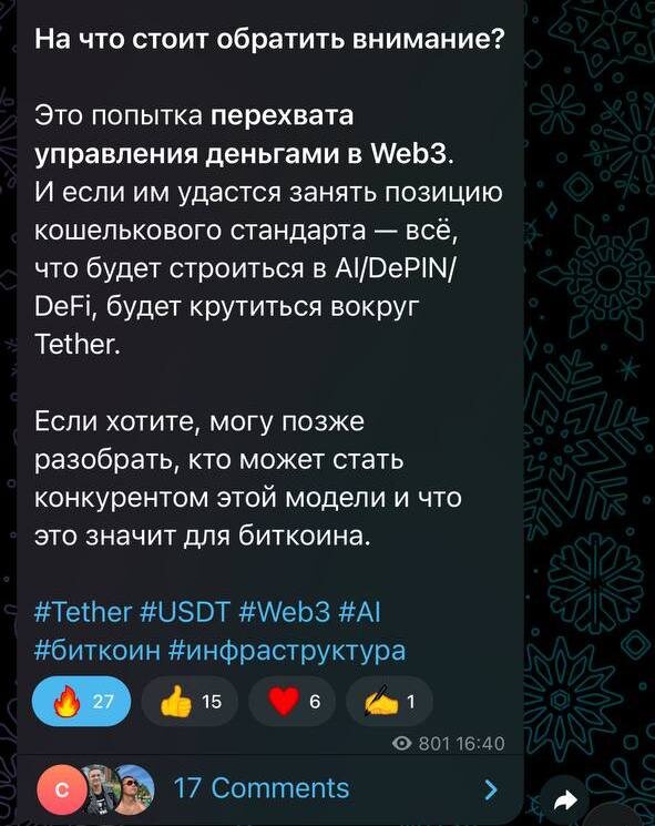 Tether играет на опережение. Не ждёт регулирования. Не боится блокировок. И делает ставку на то, что в новой экономике выиграет не тот, у кого бумажка от государства, а тот, чья технология встроится в миллиард устройств.