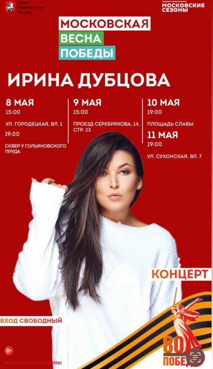 🎙Ирина Дубцова выступит с бесплатным концертом в честь Дня Победы. 🕓8 мая в 15:00 🗺️Городецкая вл1 🕓8 мая в 19:00 🗺️Сквер у Гольяновского пруда 🕓9 мая в 15:00 🗺️Проезд Серебрякова 14с2 🕓10 мая в 19:00 🗺️Площадь Славы 🕓11 мая в 19:00 🗺️Сухонская вл7 Не забудь поделиться с другом/подругой чтобы пойти вместе 🫶 #концерт #музыка #москва #бесплатно #афиша #анонс_концерта@free_concerts_moscow