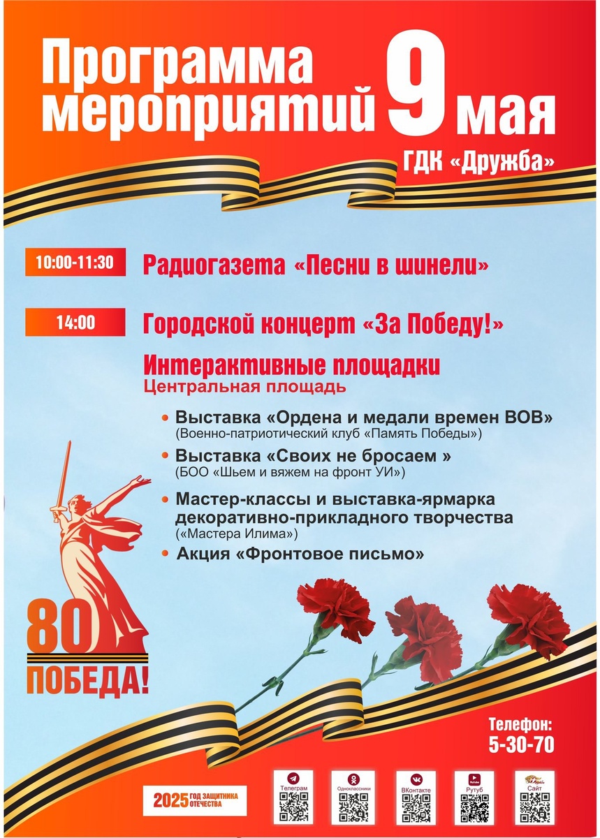Программа мероприятий на 9 Мая 10.00-11.30 – радиогазета 14.00 – городской концерт “За Победу!” 14.00 – интерактивные площадки на центральной городской площади ➡️ выставка “Ордена и медали времен ВОВ” ➡️ выставка “Своих не бросаем” ➡️ мастер-классы и выставка-ярмарка от “Мастеров Илима” ➡️ акция “Фронтовое письмо”